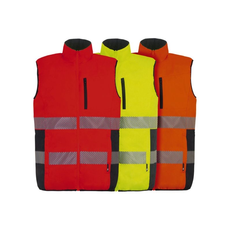 Extérieur 100% polyester. Intérieur : doublure matelassée en duvet polyester. Bandes rétroréfléchissantes microbilles segmentées thermocollées : 2 ceintures. Face «sécurité» : fermeture centrale à glissière avec curseur réversible. Poche poitrine fermée par fermeture à glissière, 2 poches basses avec rabat fermées par fermeture à glissière. Face non haute visibilité : matelassage style doudoune, poche poitrine fermée par fermeture à glissière, 2 poches basses avec rabat fermées par fermeture à glissière. Entretien : lavage ménager Système Fit&Zip permettant d’adapter ce gilet aux parkas hivi Annapurna réf. 17627 ou Everest réf. 114607. Coloris : jaune fluo/marine, orange fluo/marine, rouge fluo/marine Taille : S à 3XL Norme : CE Cat II - EN ISO 20471 (2)