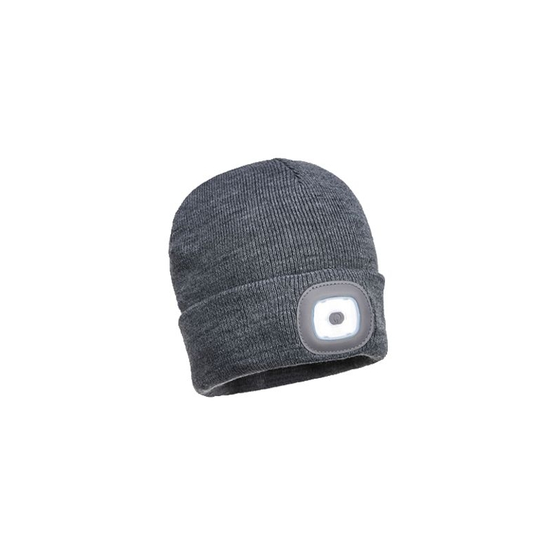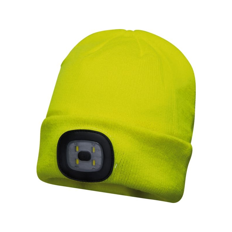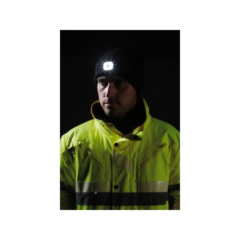 Tricot 100% acrylique. Lumière LED amovible et rechargeable par USB. Autonomie 2 à 4h Puissance : 150 Lm Coloris : bleu marine, noir, jaune, orange Taille : unique