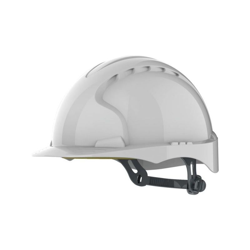 Calotte en polyéthylène haute densité (PEHD). Rainures latérales pour protection auditive ou visière. Coiffe en polyéthylène 6 points, bandeau de confort Chamlon™ Tour de tête réglable par glissière OneTouch™ de 49 à 63 cm. Ventilé, gouttière intégrée. Durée de stockage : 2 ans à compter de la date de fabrication Durée de vie en utilisation : 3 ans à compter de la mise en service Coloris : bleu, blanc, jaune Normes : CE Cat II - EN 397