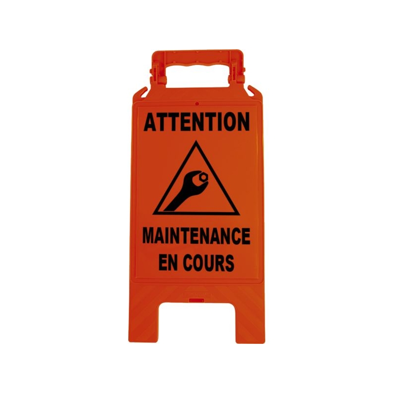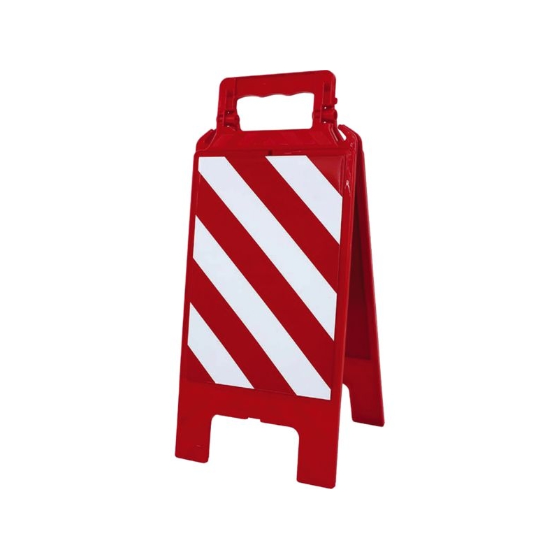 En polypropylène avec renforts de maintien. Utilisation temporaire intérieure et extérieure. Poignée ergonomique, large surface d'impression. Clip de maintien en position ouverte, grande stabilité. Crochets pour chaîne de signalisation. H x l : 600 x 275 mm Épaisseur (plié) : 23 mm