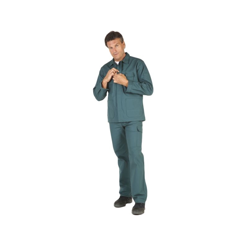 100% coton - Croisé, 320 g/m². Traité antiretrait. Ceinture 5 passants avec élastique côtés, braguette boutons, poches italiennes doublées du même tissu, poche cuisse à rabat fermé par grippers cachés, 1 poche arrière à bouton et 1 poche mètre. Entrejambe : 82 cm Coloris : blanc, bleu bugatti, gris Taille : 0 à 6