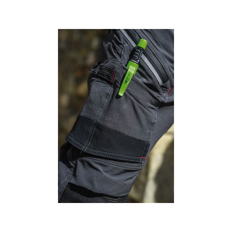 94% nylon 6% spandex, 260 gr/m2. Tissu de renfort 93% polyamide 7% polyester, 230 gr/m². Ceinture droite élastiquée côtés, avec braguette fermeture à glissière et bouton clou. Sangle et boucle D. 3 passants larges au dos. 2 poches italiennes, 2 poches revolver plaquées avec bas volants fermées par velcros, 2 poches cuisses dont la droite zippée et renforcée Cordura® avec surpoche à double compartiment (1 fermé par velcro et 1 avec sangle plaquée) Emplacements pour genouillères avec pinces et rabat + bandes rétro réfléchissantes, réf. 100483 (à commander séparément). Entrejambe avec triple surpiqûre. Panneau aisance à l'entrejambe, ourlet bas de jambe en Cordura®. Coloris : marine/noir, gris/noir, noir Taille : 36 à 60 Norme : CE Cat II - EN 14404 porté avec genouillères