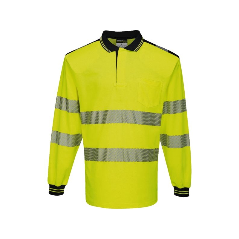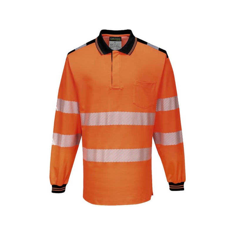 55% coton 45% polyester – Maille piquée, 175 g/m². Bandes rétroréfléchissantes segmentées - respirantes, extensibles et légères. La segmentation de la bande permet l’évacuation de la transpiration et optimise le confort par forte chaleur. Col polo, 1 poche poitrine côté gauche. Manches longues. Entretien : lavage ménager (certifié 50 lavages) Protection contre les rayons UV : UPF 40+ Coloris : jaune fluo/marine, orange fluo/marine Taille : S à 5XL Norme : CE Cat II - EN ISO 20471 (3)
