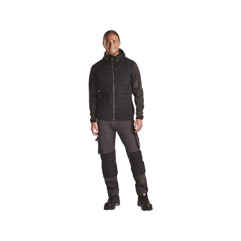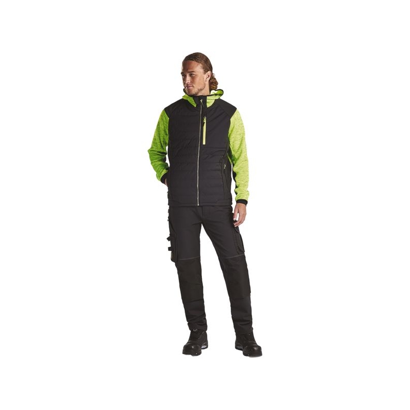 Bimatière : Tricoté, 100% polyester, 380 g/m² - brossé face intérieure Matelassé, 100% polyester, 380 g/m² Intérieur : matelassé sur le torse, à l'arrière et partiellement sur la capuche et les épaules Capuche fixe, fermeture à glissière plastique sous rabat interne. 1 poche poitrine et 2 poches avant avec fermeture à glissière Dos allongé, bas de manche élastiqué Entretien : lavage ménager Coloris : rouge/noir, jaune/noir, marine/noir, gris foncé/noir, gris/noir, orange/noir Taille : XS à 4XL