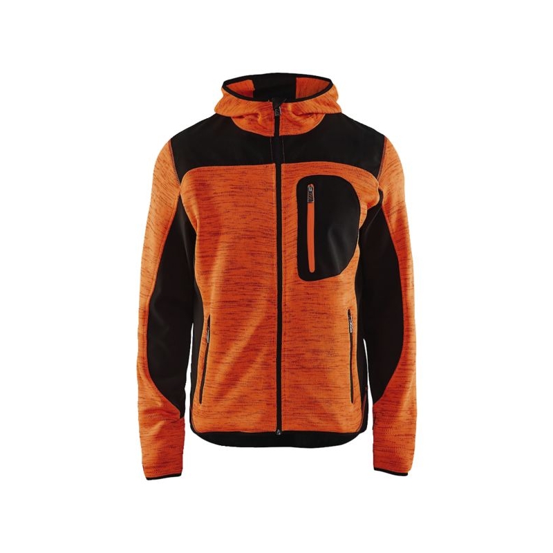 Bimatière : tricoté 100% polyester, 380 g/m². Softshell 3 couches (94% polyester 6% élasthanne enduit TPU) + 100% polyester polaire, 330 g/m². Softshell doublé polaire sur les épaules, les côtés et les bras. Fermeture à glissière jusqu’en haut du col et multipoches. Capuche fixe et dos relevé. Coloris : jaune fluo/noir, vert armée/noir, orange fluo/noir, marine foncé/jaune, marine foncé/noir, marine/marine, gris chiné/noir, bleu/noir, gris anthracite/noir Taille : XS à 4XL