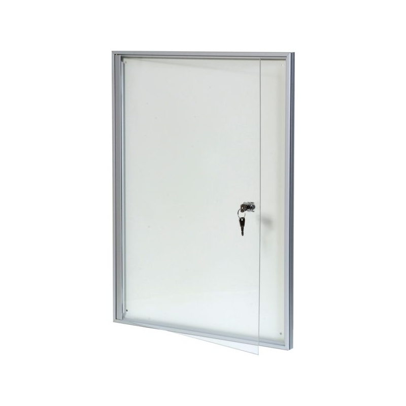 Porte battante, fermeture par serrure à clé avec pose à droite. Profil alu anodisé naturel, façade plexiglass avec entourage à partir du formats 6 feuilles. Fond tôle blanc pour affichage magnétique. Fixation murale 4 points. Absence d'entourage de porte pour le format 4 feuilles. Épaisseur hors-tout : 20 mm Épaisseur utile : 12 mm
